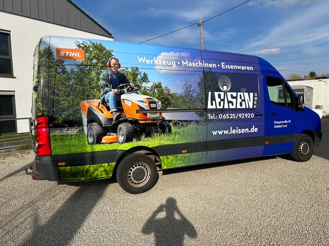 Wir montieren alle Elemente vor Ort, z. B. an Ihrem Firmengebäude oder Gelände, Fahrzeuge können wir in unserer eigenen Werkstatt veredeln, folieren, bedrucken.