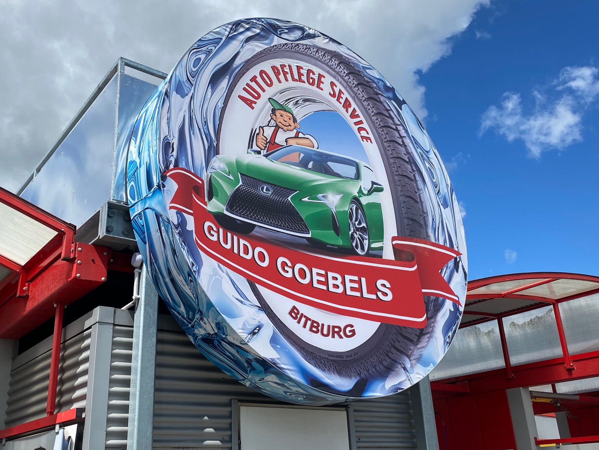 Wir montieren alle Elemente vor Ort, z. B. an Ihrem Firmengebäude oder Gelände, Fahrzeuge können wir in unserer eigenen Werkstatt veredeln, folieren, bedrucken.